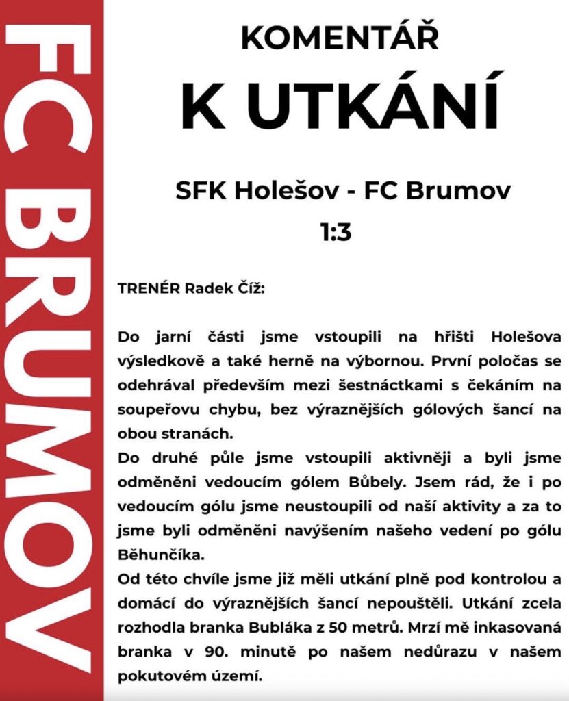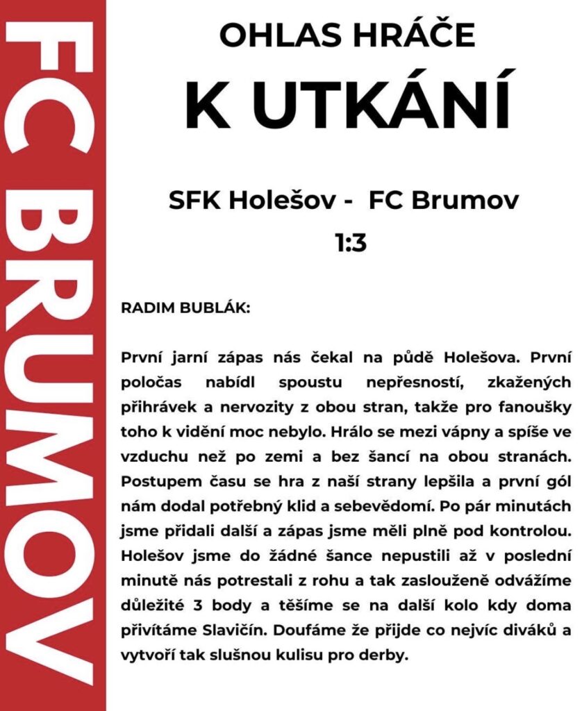 SFK Holešov – FC Brumov 1:3 Uncategorized 8 března, 20269 března, 2026 ⚽️ 58′ Bůbela Jaroslav, 61′ Běhunčík Vilém, 73′ Bublák Radim Sestava: Struhař J. – Grygar, Struhař M., Macháč (84′ Fojtík J.), Juřica, Kubiš (84′ Opravil), Běhunčík, Rodek (75′ Filgas), Chovanec (70′ Bartoš), Bůbela (70′ Kusák), Bublák